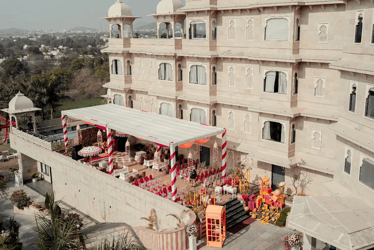 As experienced wedding planners, Seven Pearl India curates unforgettable weddings at Traavista Aravali Mahal with seamless planning, décor styling, and guest management—turning this majestic venue into your dream wedding destination in Udaipur.
